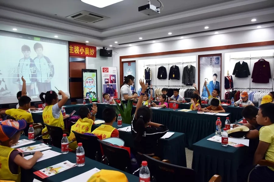 隨后,小記者們來到新希望學生裝生產(chǎn)企業(yè)百裕集團營銷中心,齊聚服裝展示廳共同深入探討學生裝知識。會上,小記者們共同觀看了“學生裝生產(chǎn)流程視頻”,并回顧往年“新希望”學生裝款式等內(nèi)容。