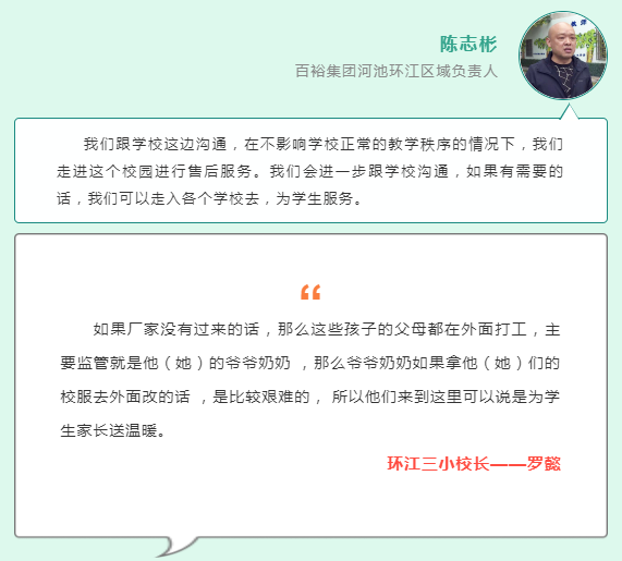 據(jù)了解,2017年6月百裕集團環(huán)江裕美扶貧車間成為環(huán)江中小學(xué)的校服供應(yīng)商之一,同時也在環(huán)江縣城橋西路開設(shè)了售后服務(wù)部針對校服不合身等問題進行售后服務(wù)。