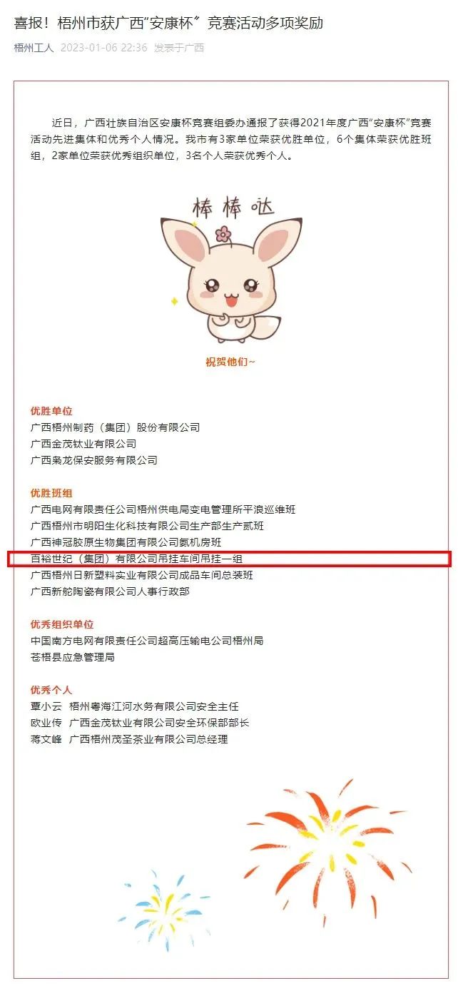 1月06日,廣西壯族自治區(qū)安康杯競賽組委辦通報了獲得2021年度廣西“安康杯”競賽活動先進集體和優(yōu)秀個人情況。百裕世紀(集團)有限公司吊掛車間吊掛一組榮獲“優(yōu)勝班組”稱號。