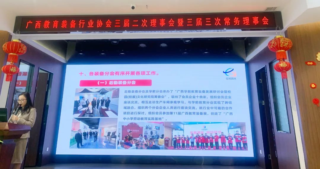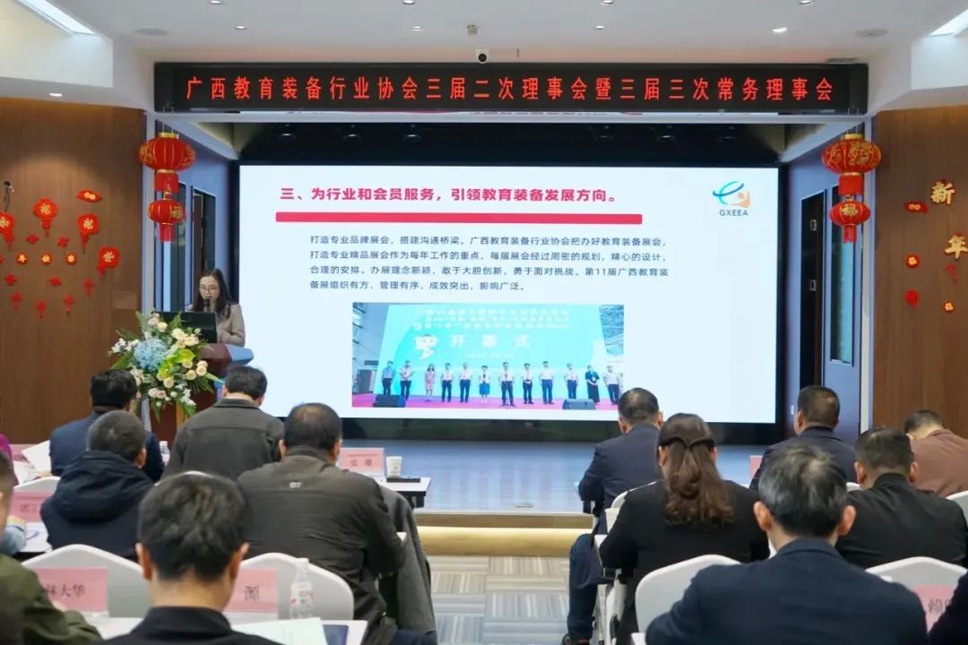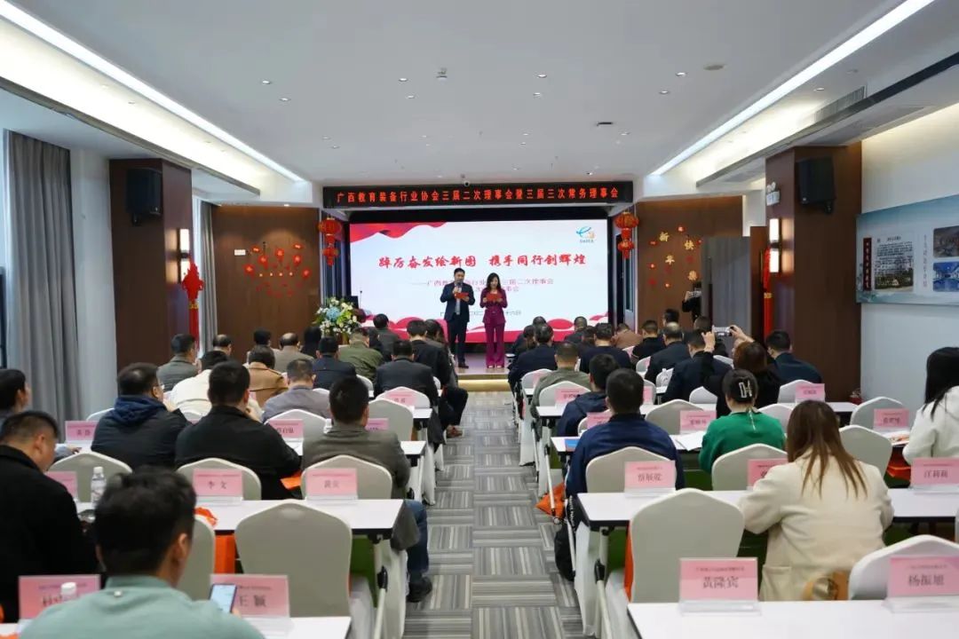2023年2月16日,廣西教育裝備行業(yè)協(xié)會三屆二次理事會暨三屆三次常務(wù)理事會圓滿召開。協(xié)會會長、常務(wù)副會長、常務(wù)理事、理事以及部分特邀企業(yè)代表共100多人參加會議。區(qū)教育廳、南寧市、崇左市、玉林市、貴港市、欽州市等市縣教育裝備站領(lǐng)導(dǎo)蒞臨會議指導(dǎo)。