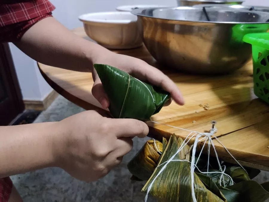 活動現(xiàn)場,員工們有的動作麻利優(yōu)美,卷葉-填料-打結(jié).....,轉(zhuǎn)眼間就包出了一個棱角分明的粽子;有的因?yàn)闆]有經(jīng)驗(yàn),繩子還沒來得及捆,粽子葉就散了,糯米灑了一桌。
