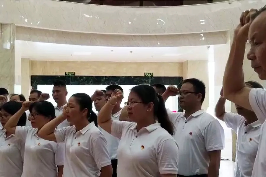 ★ 宣誓現(xiàn)場(chǎng)莊嚴(yán)肅穆,在領(lǐng)誓人謝勝海書記的帶領(lǐng)下,全體黨員面對(duì)鮮紅黨旗,莊嚴(yán)地舉起右手,重溫對(duì)黨的忠誠誓言。