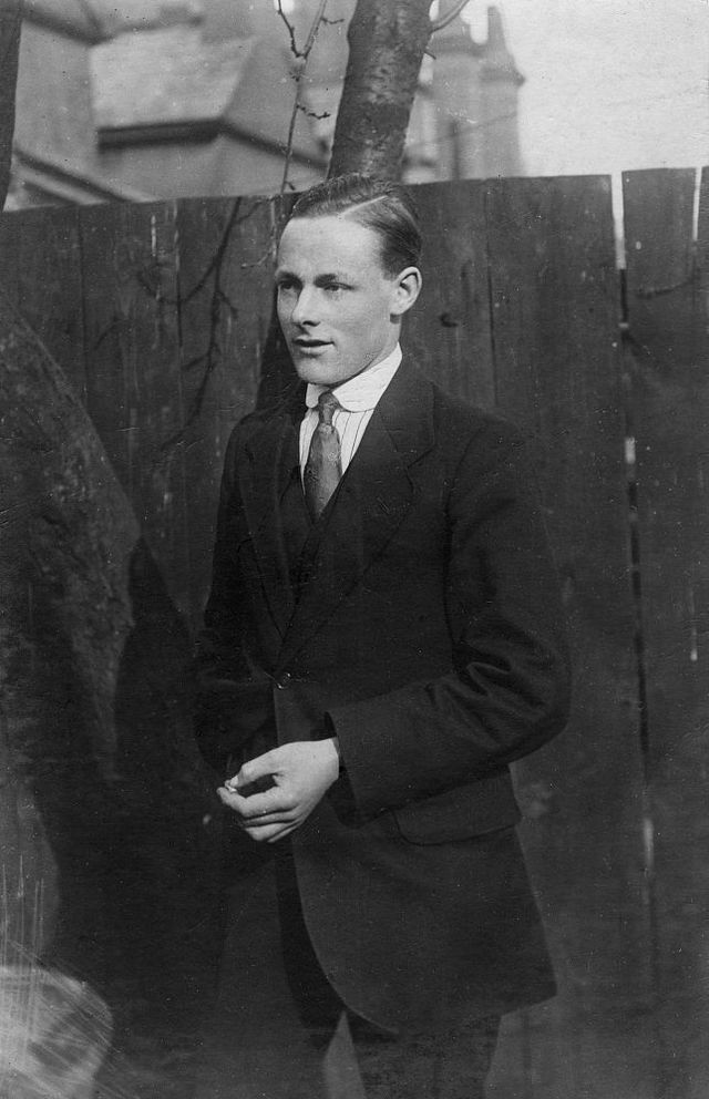 20世紀(jì),攝影圖,穿西服的男人。這個(gè)時(shí)期的領(lǐng)帶已經(jīng)出現(xiàn)了各種花色和不同的紋路。