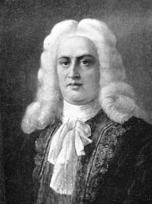 插畫(huà),德國(guó)作曲家喬治·弗里德里希·亨德?tīng)?/span>(1685-1759)。這個(gè)時(shí)期領(lǐng)帶的樣式在法朗士小說(shuō)《領(lǐng)帶》中可見(jiàn) :" 他的暗綠色上裝的領(lǐng)子豎得很高,他穿著一件南京紫花布背心,黑綢子寬領(lǐng)帶在他的頸子上繞了三圈。"