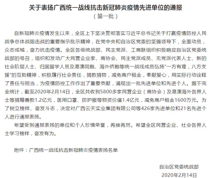 2月14日,自治區(qū)黨委統(tǒng)戰(zhàn)部表揚447個抗疫先進單位(個人),百裕集團在這次新冠肺炎病毒疫情愛心公益行動中,積極擔當作為,認真履行企業(yè)應盡的社會責任,捐款、捐物等公益表現(xiàn)得到了自治區(qū)統(tǒng)戰(zhàn)部的表揚,我們將珍惜榮譽,再接再厲,為打贏防控狙擊戰(zhàn)做出貢獻。